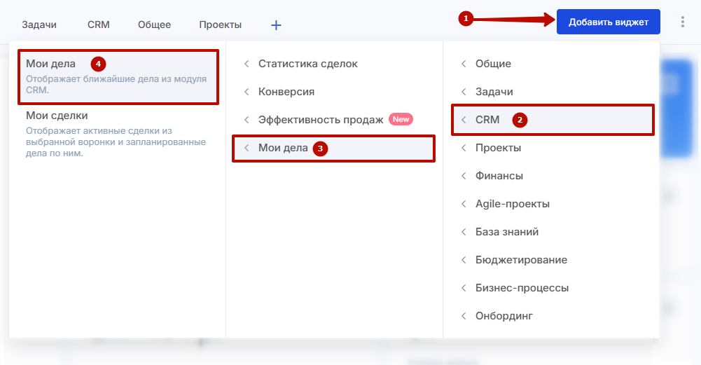 Чтобы найти виджет, нажмите кнопку «Добавить виджет» (1) и во вкладке «CRM» (2) выберите раздел «Мои дела» (3) и в списке выберите «Мои сделки» (4).