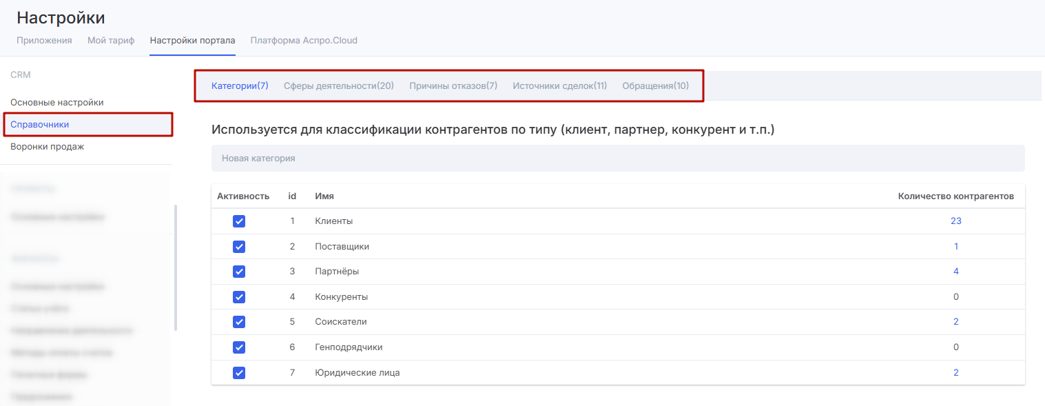 Каждой строке справочника соответствует одна категория. Любую категорию можно активировать или деактивировать постановкой галки в чекбоксе слева.