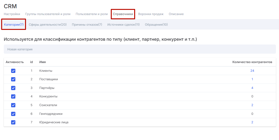 Управление категориями контрагентов находится в настройках модуля «CRM» в разделе «Справочники».