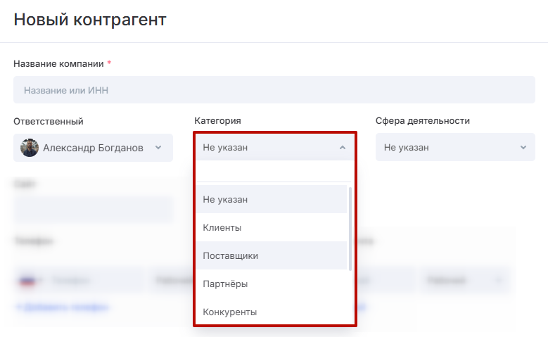 Если у вас настроены категории контрагентов, вы сможете их выбрать при создании нового контрагента или редактировании существующего.