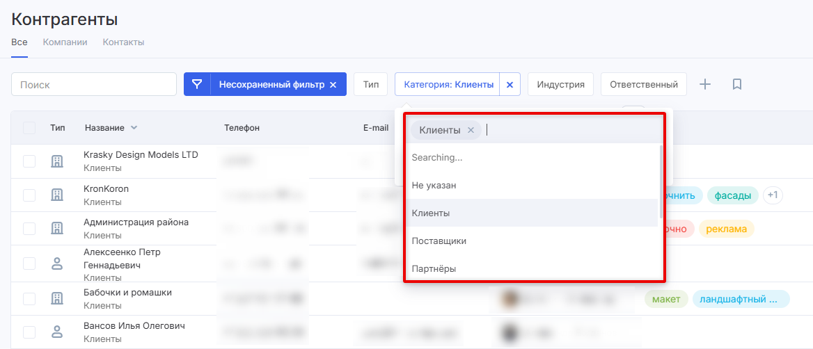 По этим категориям вы также сможете фильтровать список контрагентов — это упростит анализ вашей целевой аудитории, конкурентов и т. д.