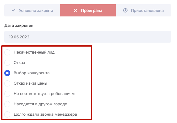 Прежде всего, причина отказа указывается при завершении сделки в статусе «Проиграна».