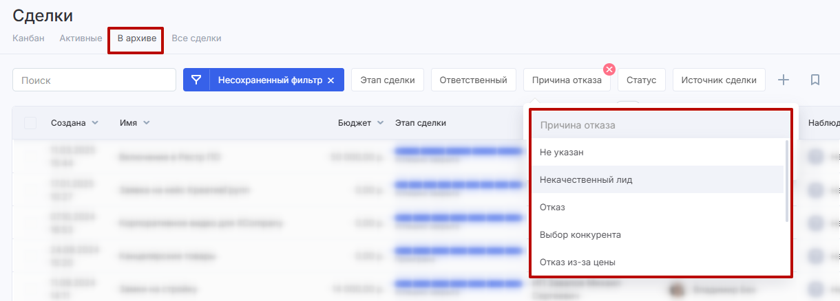 По причинам отказа можно фильтровать сделки в архиве.
