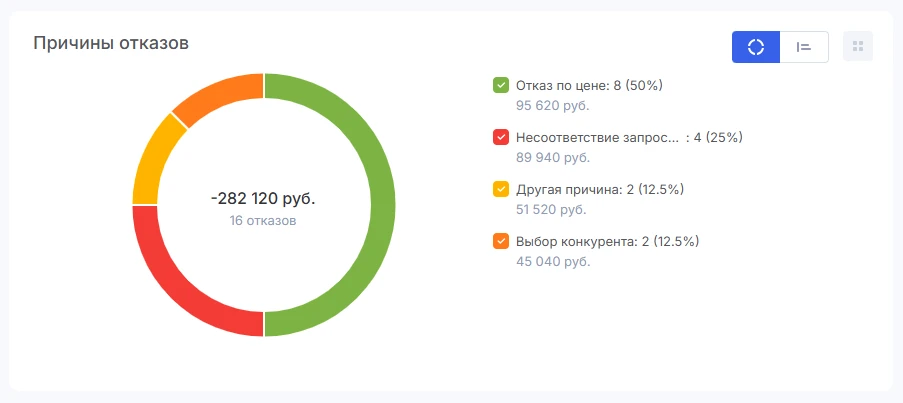 Кроме того, статистика по причинам отказа отображается в виджете «Причины отказов».