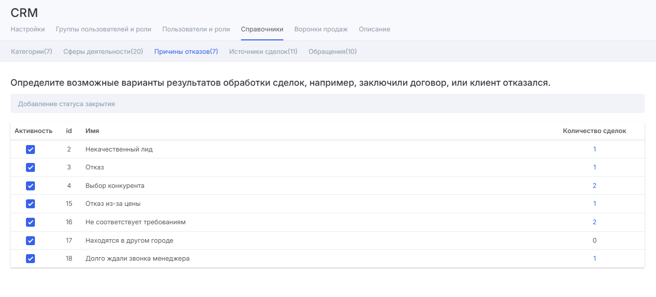 Управление причинами отказов находится в настройках модуля «CRM» в разделе «Справочники».