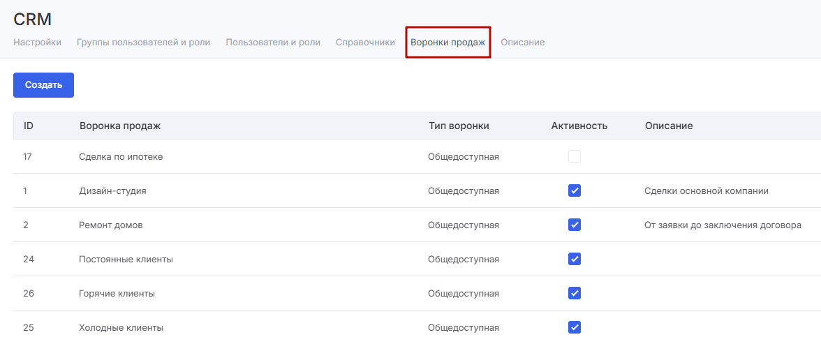 Воронкам продаж отведена отдельная вкладка в настройках модуля «CRM». Здесь можно создавать и редактировать воронки, а также удалять, активировать и деактивировать.