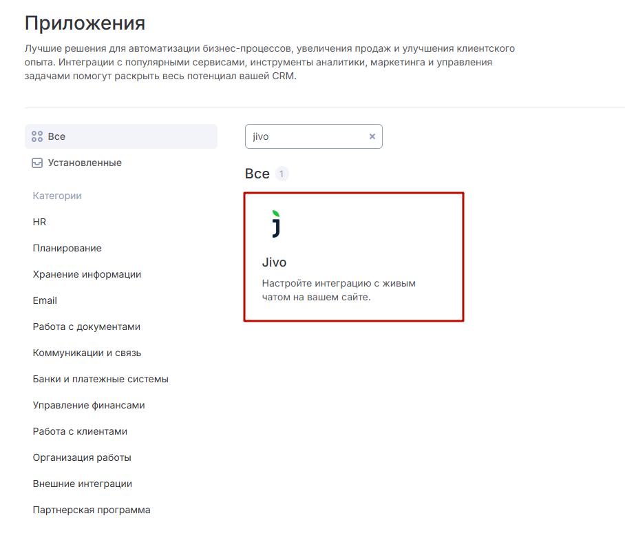 Перейдите в раздел «Приложения», найдите модуль интеграции с Jivo и установите его.
