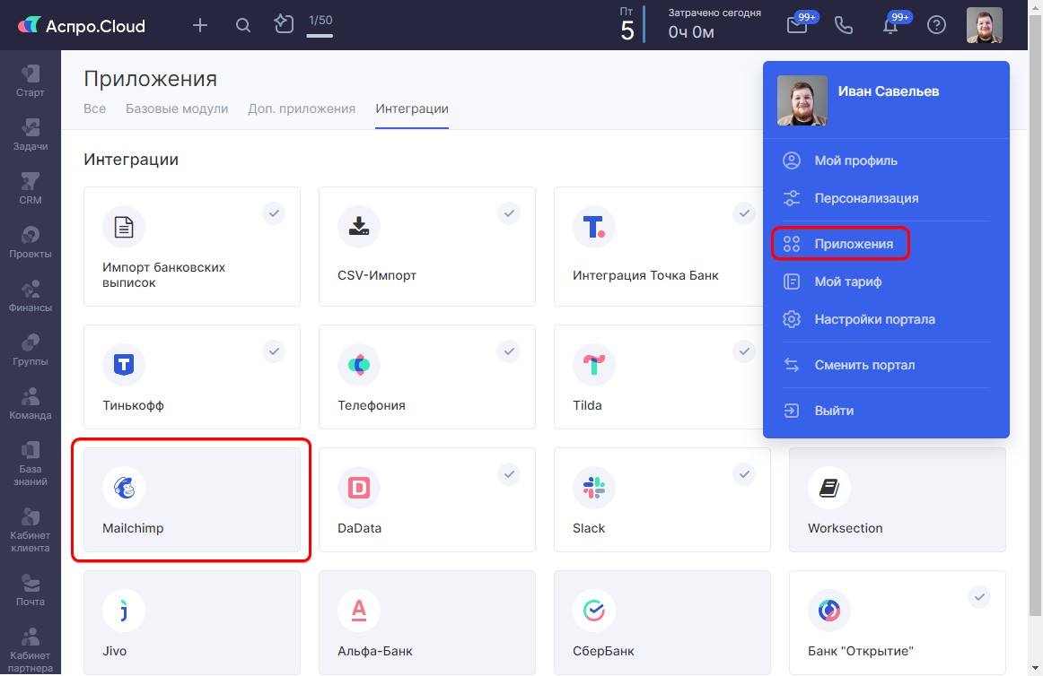 Перейдите в раздел «Приложения» и установите модуль интеграции с Mailchimp.