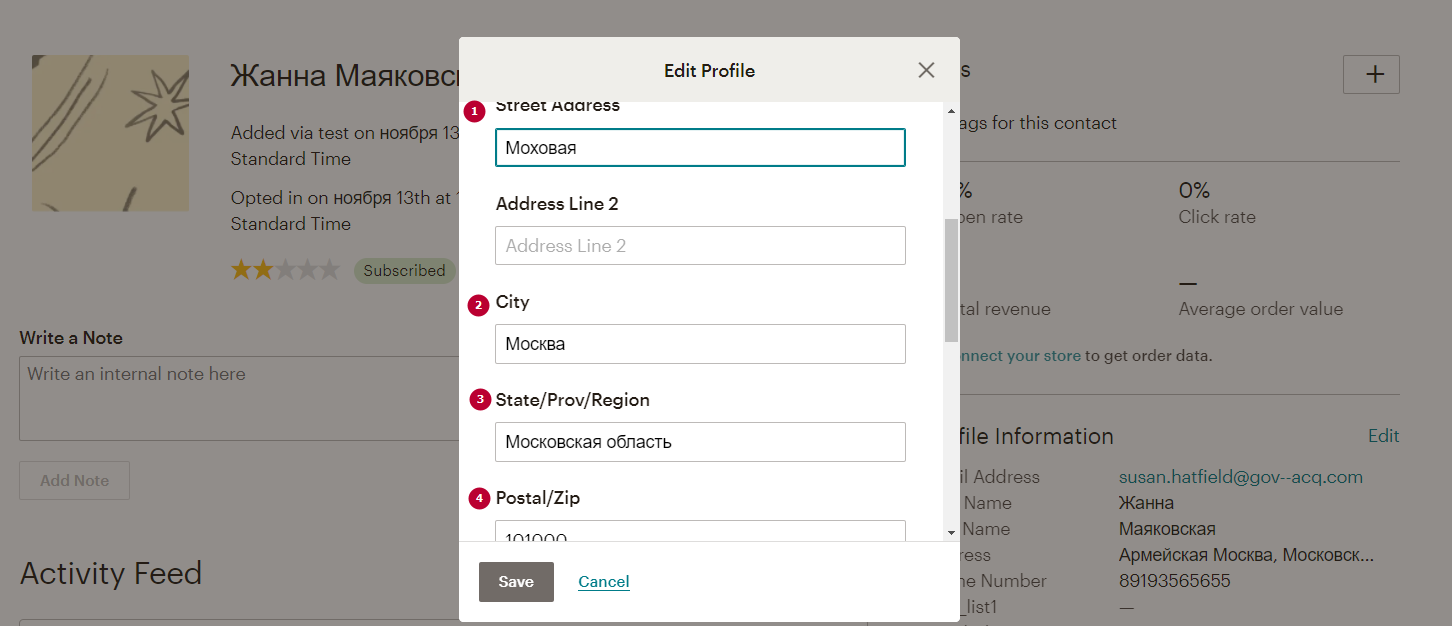 При выгрузке контактов из Аспро.Cloud в Mailchimp адрес из карточки контактов автоматически подтягивается в карточку контакта в Mailchimp при условии, что в карточке контакта Аспро.Cloud в адресе регистрации заполнены следующие поля: