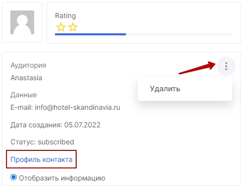 Если контрагент относится к двум и более аудиториям, то здесь можно увидеть все его карточки из каждой аудиторий MailChimp. Переключаясь между ними вы будете видеть статус контрагента и процент открытия писем в каждой из этих аудиторий.