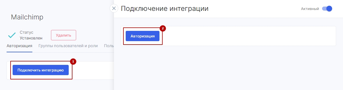 После установки перейдите в модуль, нажмите кнопку «Подключить интеграцию» (1), а затем авторизуйтесь (2) в своем аккаунте Mailchimp.