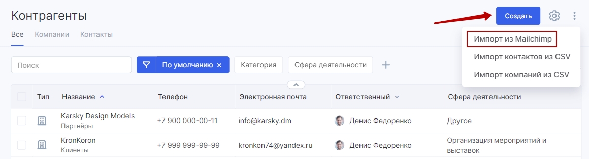Для импорта контактов из Mailchimp в Аспро.Cloud перейдите в модуль «CRM», в подраздел «Контакты» или «Компании». Нажмите кнопку «Создать» и выберите соответствующую опцию: