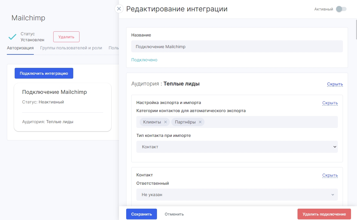 - Ответственного — при импорте контактов из Mailсhimp, все контрагенты данной аудитории будут созданы в Аспро.Cloud с указанным ответственным;