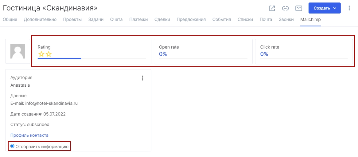 После экспорта/импорта в карточке контрагента во вкладке MailChimp будет отображаться информация о данном контрагенте из MailChimp по статусу клиента, проценту открытия писем, рейтингу и т.д.