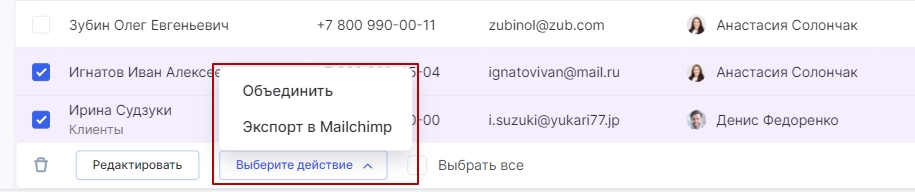 - массово выгрузить контакты из CRM в Mailchimp, отметив необходимое количество контактов/компаний.