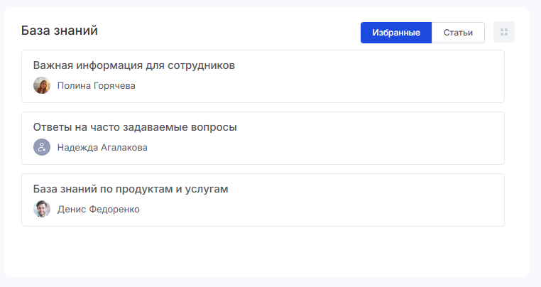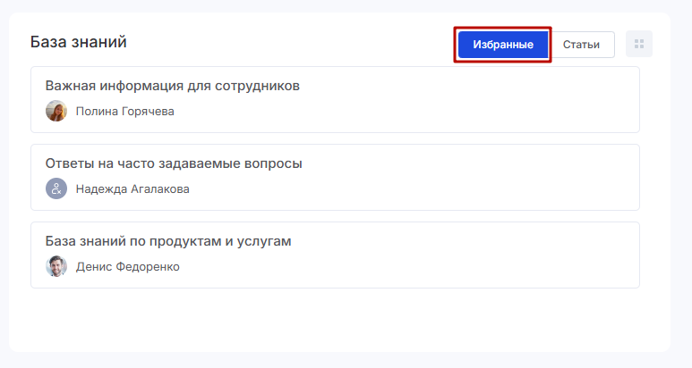 В этой вкладке отображаются базы знаний, которые вы отметили как «Избранные». Так вы сможете по одному клику перейти к нужной базе знаний прямо из виджета.