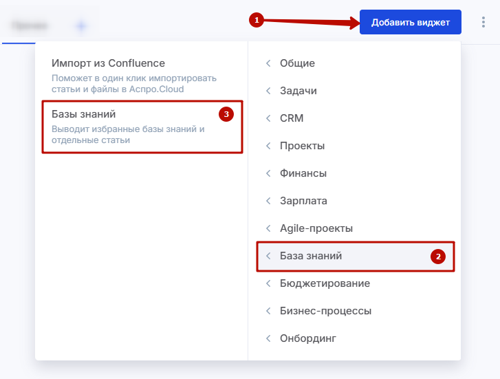 во вкладке «База знаний» (2) выберите виджет «Базы знаний» (3).