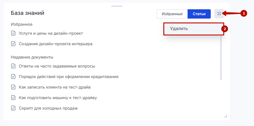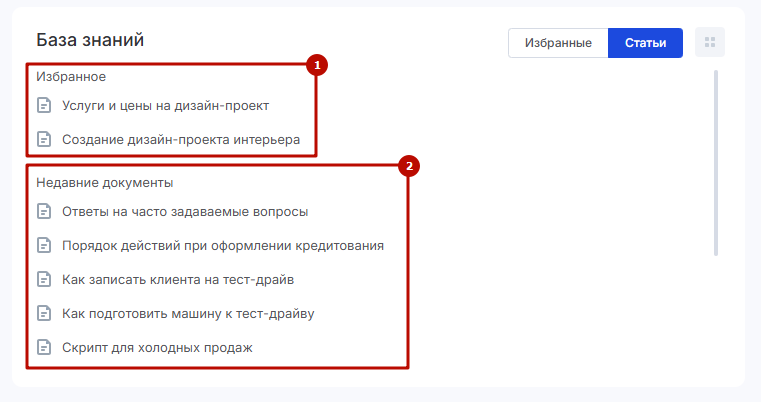 В виджете есть 2 вкладки — «Избранные» (1) для баз знаний и «Статьи» (2).