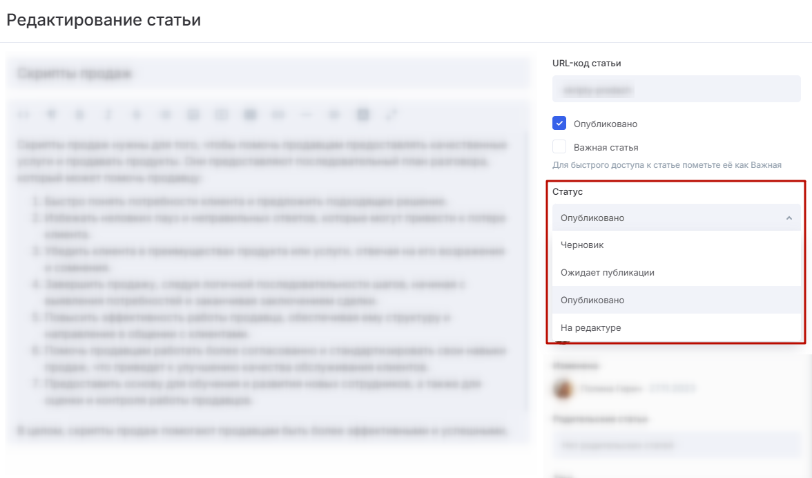 Если у вас выстроен процесс написания статей с дальнейшими проверками и редактурой, статусы помогут вам маркировать статьи в зависимости от их готовности.