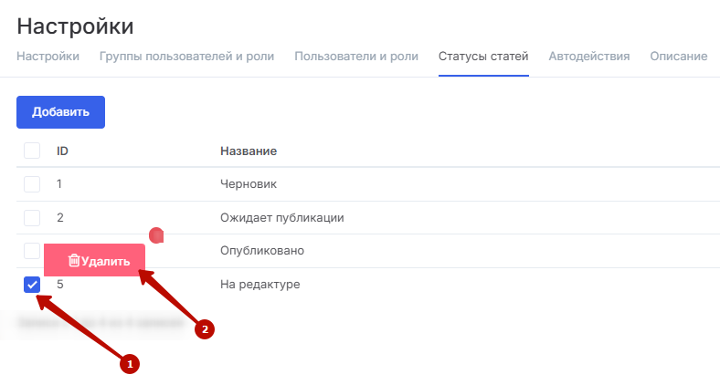 Чтобы удалить один из статусов, в том же списке поставьте галку в чекбоксе соответствующего статуса (1), затем нажмите на появившуюся кнопку «Удалить» (2) и подтвердите удаление.