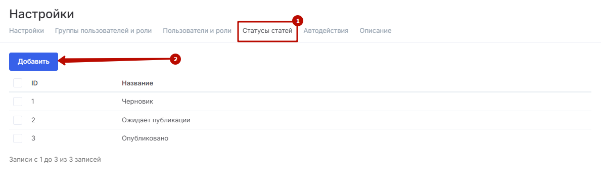 Для этого откройте настройки модуля «База знаний» и перейдите во вкладку «Статусы статей» (1). Для добавления нового статуса нажмите кнопку «Добавить» (2).