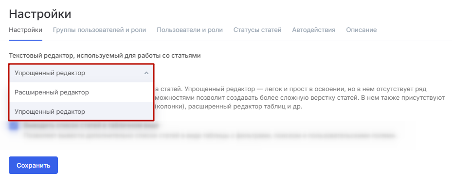 Выбрать нужный текстовый редактор можно в настройках модуля «База знаний». Во вкладке «Настройки» вы найдете соответствующий селектор.