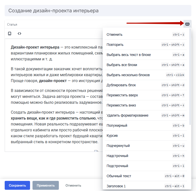 Справа доступна кнопка со списком сочетаний горячих клавиш.