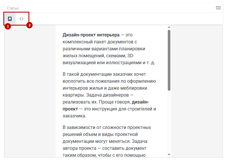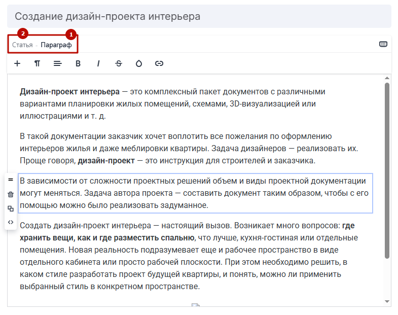 Набор доступных инструментов отличается в зависимости от уровня редактирования — если вы меняете отдельный параграф (1) или всю статью целиком (2).