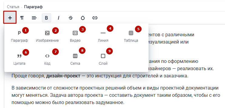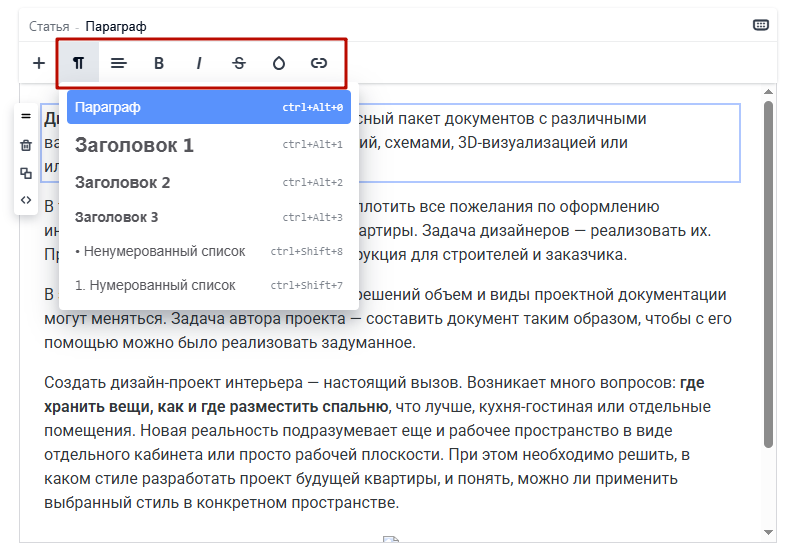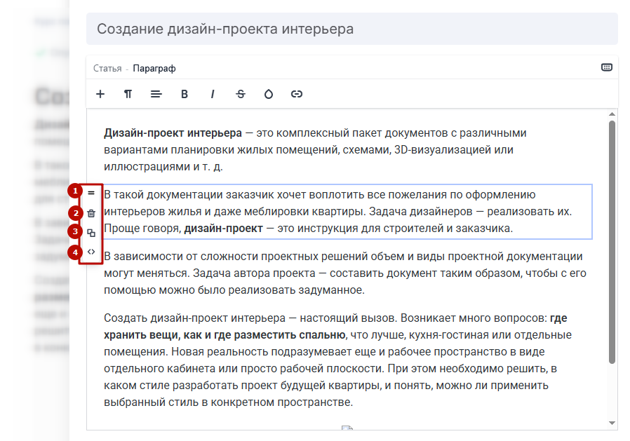 В расширенном текстовом редакторе иная структура статей. Текст в них делится на отдельные блоки — параграфы.