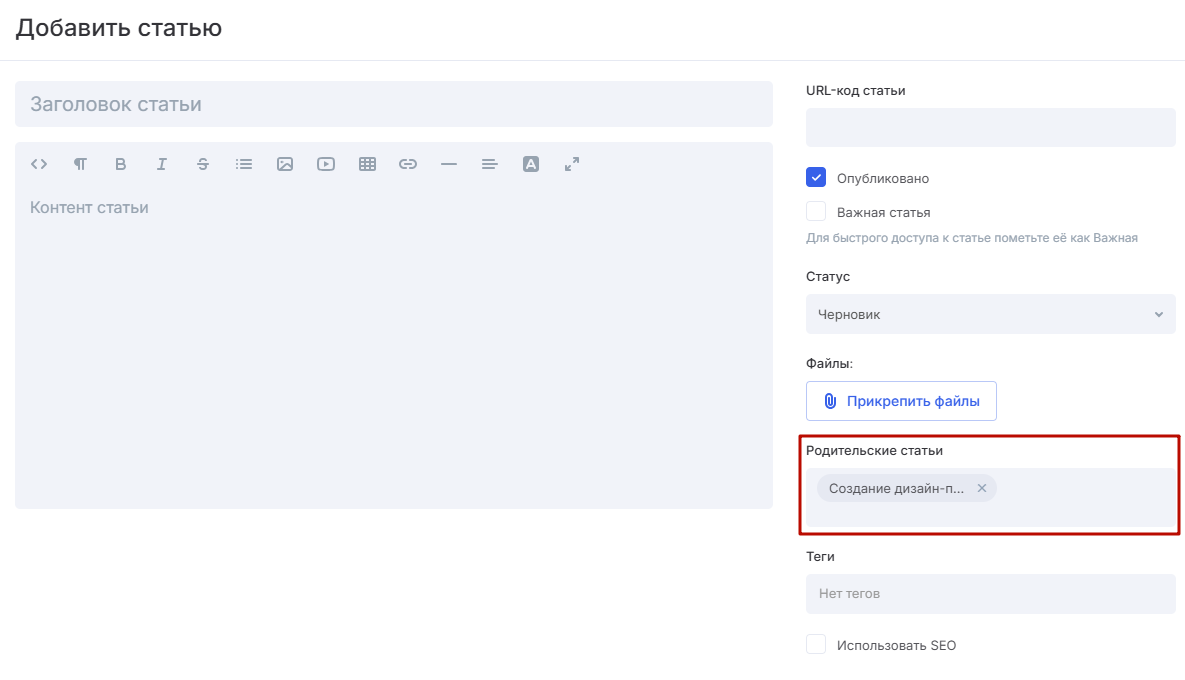В форме создания/редактирования статей есть поле «Родительские статьи». В нем отображается статья, куда будет вложена новая создаваемая статья.