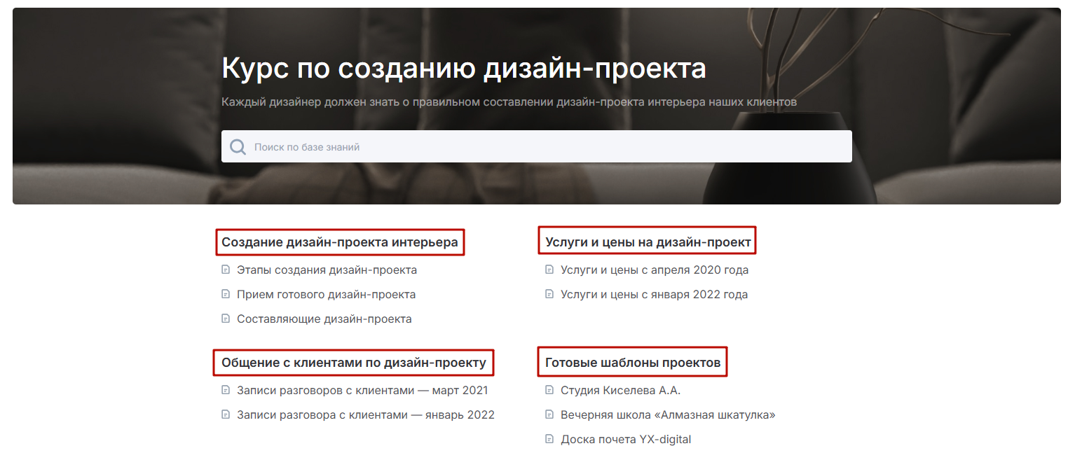 Так, статьи на самом высоком уровне иерархии внутри базы знаний образуют разделы.