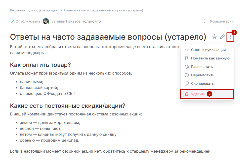 Чтобы удалить статью, откройте контекстное меню в правом верхнем углу (1) и выберите пункт «Удалить» (2).