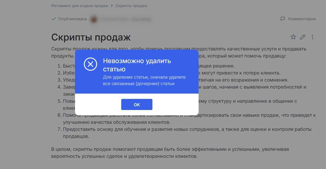 Поэтому, чтобы удалить родительскую статью, вам сначала потребуется удалить все связанные с ней статьи. После этого статья, которую вы изначально хотели удалить, потеряет статус родительской и станет доступной для удаления.