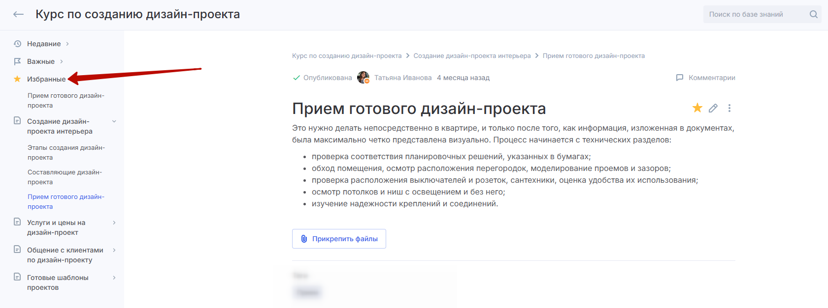 Статьи в базе знаний можно добавлять в «Избранное». Такие статьи будут отображаться списком, к которому у вас всегда будет доступ. Так вы сможете перейти к нужным статьям за минимальное число кликов, без поиска по структуре.