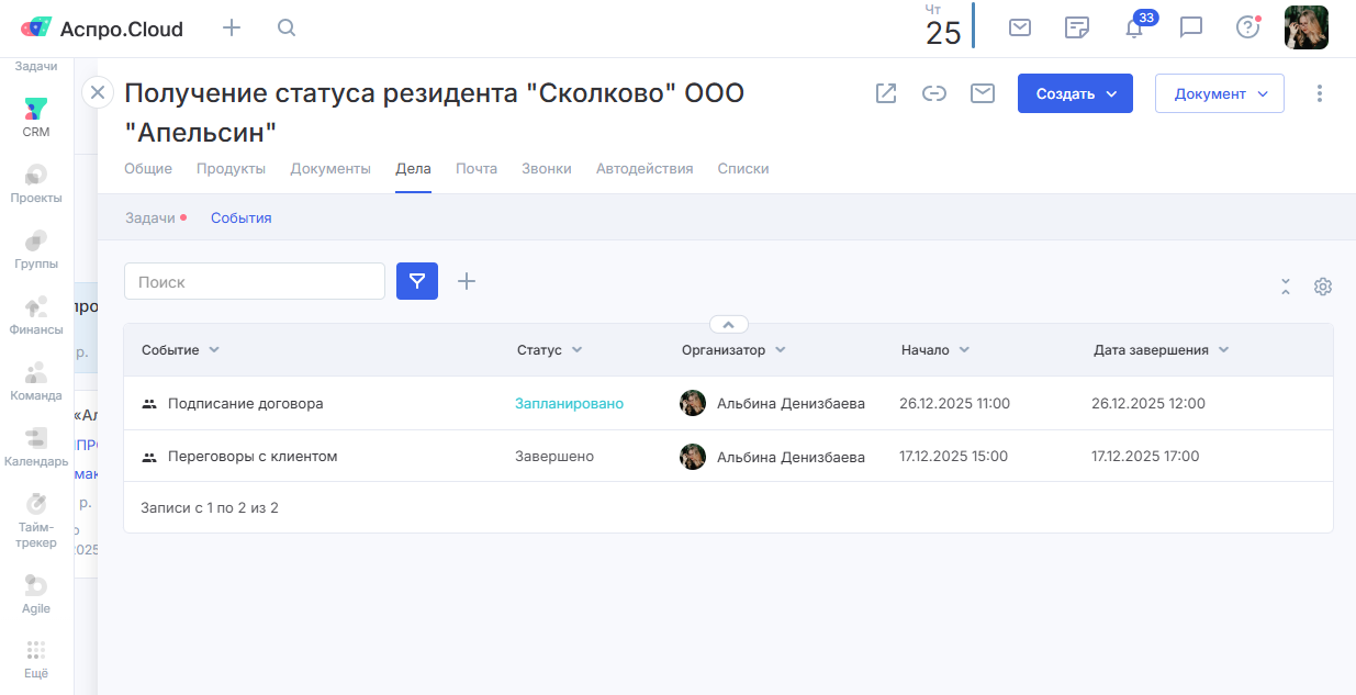 Все связанные со сделкой события можно увидеть во вкладке «Дела». В таблице отображается название, их статус, организатор, дата начала и завершения события.