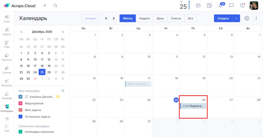 Новое событие автоматически появится в календаре.
