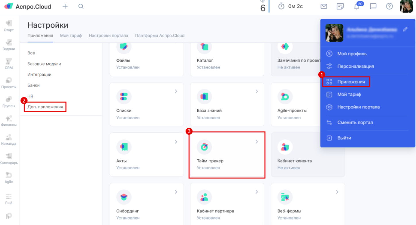 В списке приложений найдите Тайм-трекер (3) и кликните на него.