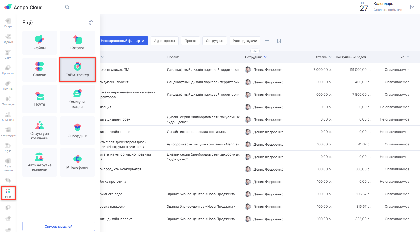 Раздел «Тайм-трекер» расположен в главном меню Аспро.Cloud. Он состоит из блока «Управление ставками» и таблицы «Список записей», в которой отображаются записи о затраченном времени. В таблице для каждой записи доступны данные: