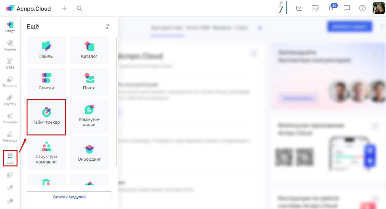 Если модуля «Тайм-трекер» нет в боковом меню, нажмите на кнопку «Еще» — слева откроется дополнительное окно, в котором можно найти и выбрать модуль «Тайм-трекер».