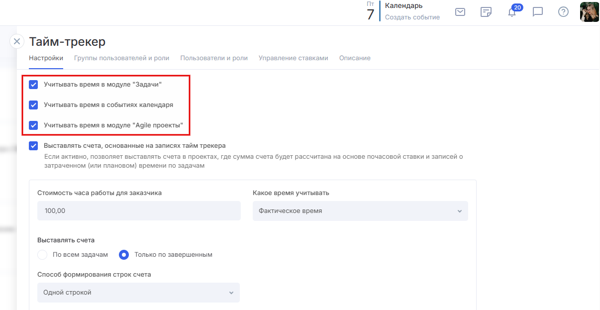Можно включить или отключить учет времени для задач, событий календаря и Agile-проектов. По умолчанию опция будет активирована.