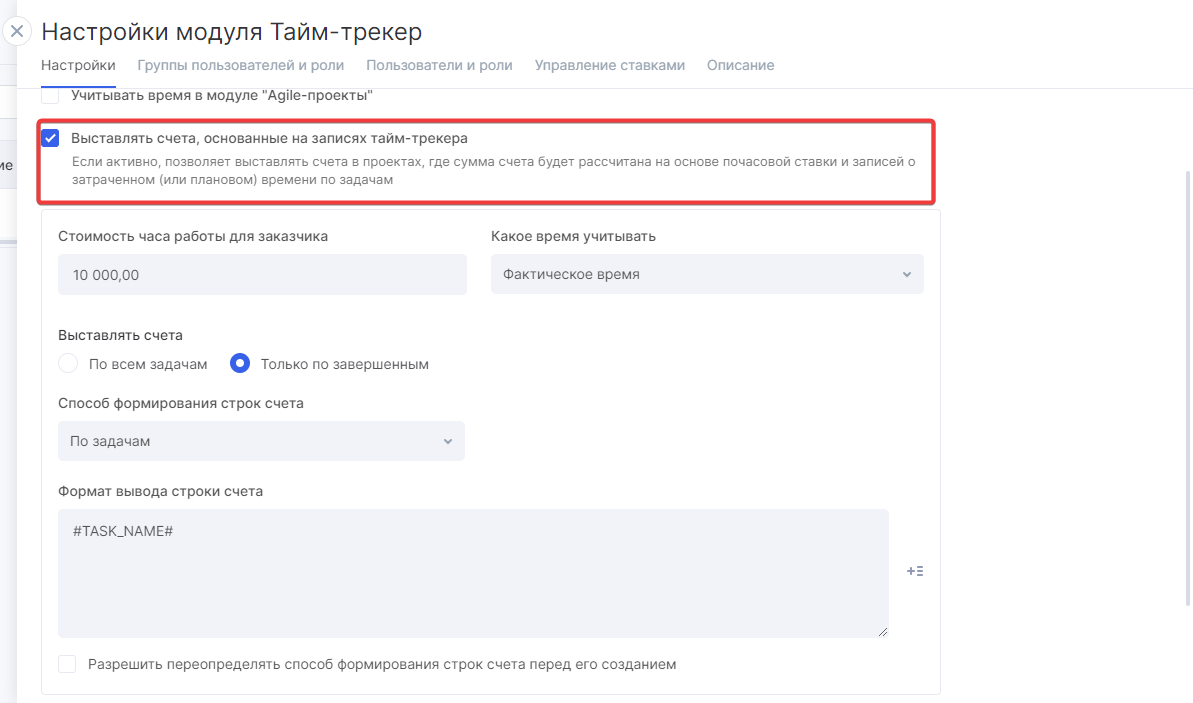Активация опции позволит автоматически выставлять счета на основе данных из тайм-трекера. Система сама рассчитает сумму по заданным ставкам и упростит оформление счета. Это позволяет быстро и точно выставлять счета за проделанную работу без ручных расчетов. Подробнее о создании счетов читайте в соответствующей статье. Ниже разберем базовые настройки.