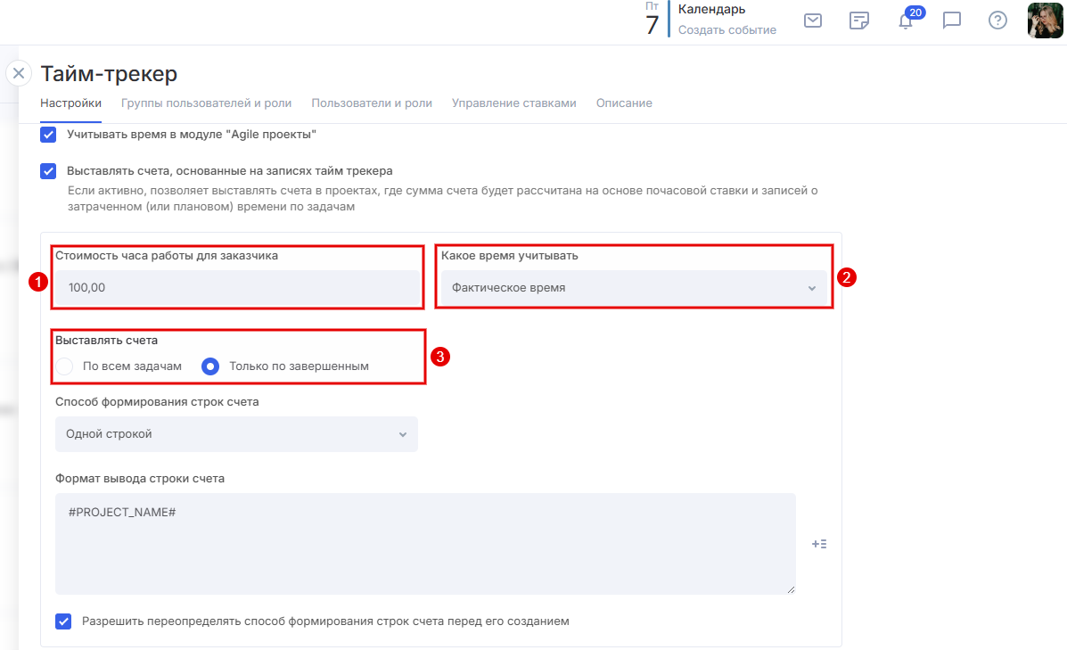 формат вывода строки счета — позволяет добавить описание с переменными в строки счета. Например, вы можете автоматически подставлять туда дату, название задачи или название проекта, по которому выставляется счет.