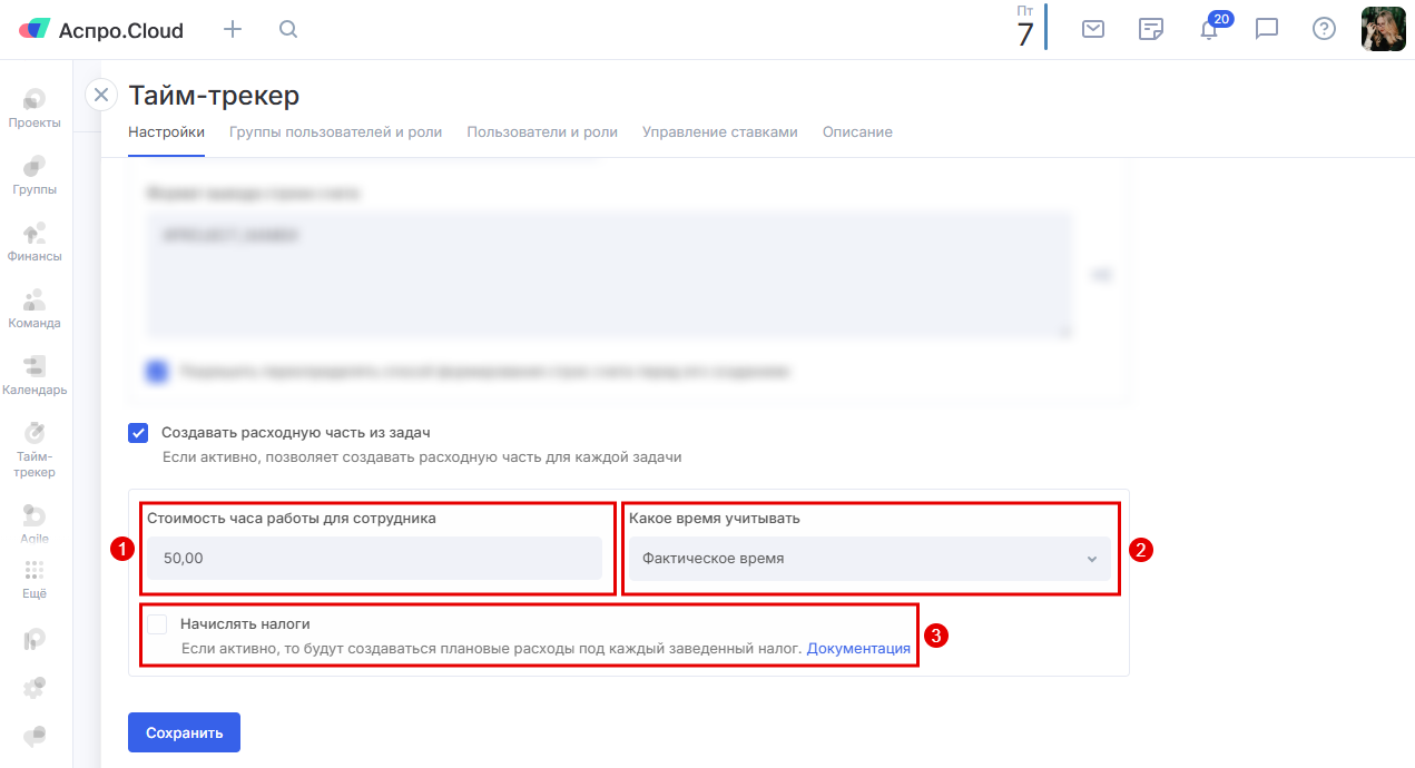Опция позволит создать плановый расход относительно стоимости часа работы сотрудника (1). Также доступна возможность выбора нужного типа времени для учета (2). Дополнительно можно активировать опцию начисления налога на затраченное время (3).