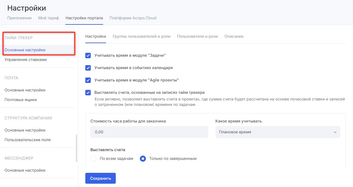 Перейдите в «Настройки портала» → «Тайм-трекер» → «Основные настройки».