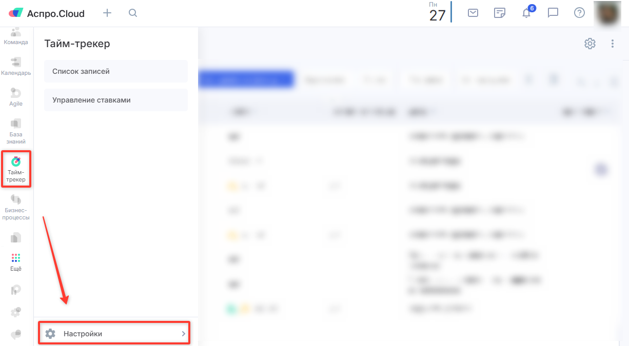 Нажмите на модуль «Тайм-трекер» в боковом меню и через появившуюся вкладку перейдите в «Настройки».