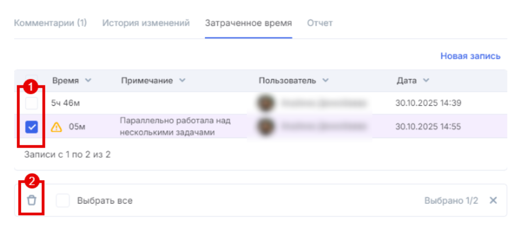 Отметку о затраченном времени можно удалить. Для этого выделите в списке нужные отметки (1) и кликните по иконке удаления ниже (2). После этого итоговое значение таймера изменится.