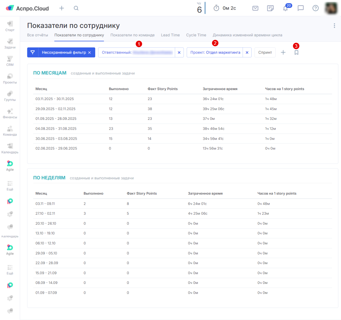 Через фильтры укажите нужного сотрудника (1) и проекты, в которых он участвует (2). Вы можете сохранить установленный фильтр, чтобы не настраивать его каждый раз при просмотре отчетов (3).