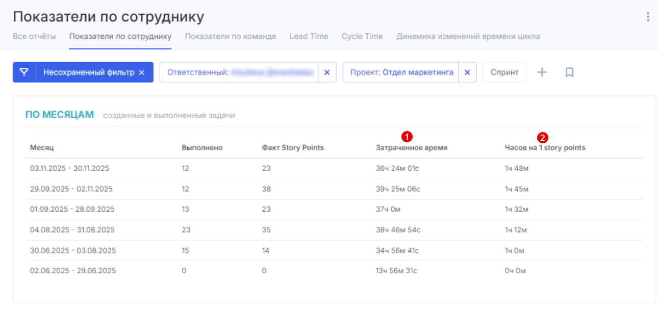 Отчеты по сотруднику позволяют получить детальную информацию о времени, затраченном конкретным участником команды на выполнение задач.
