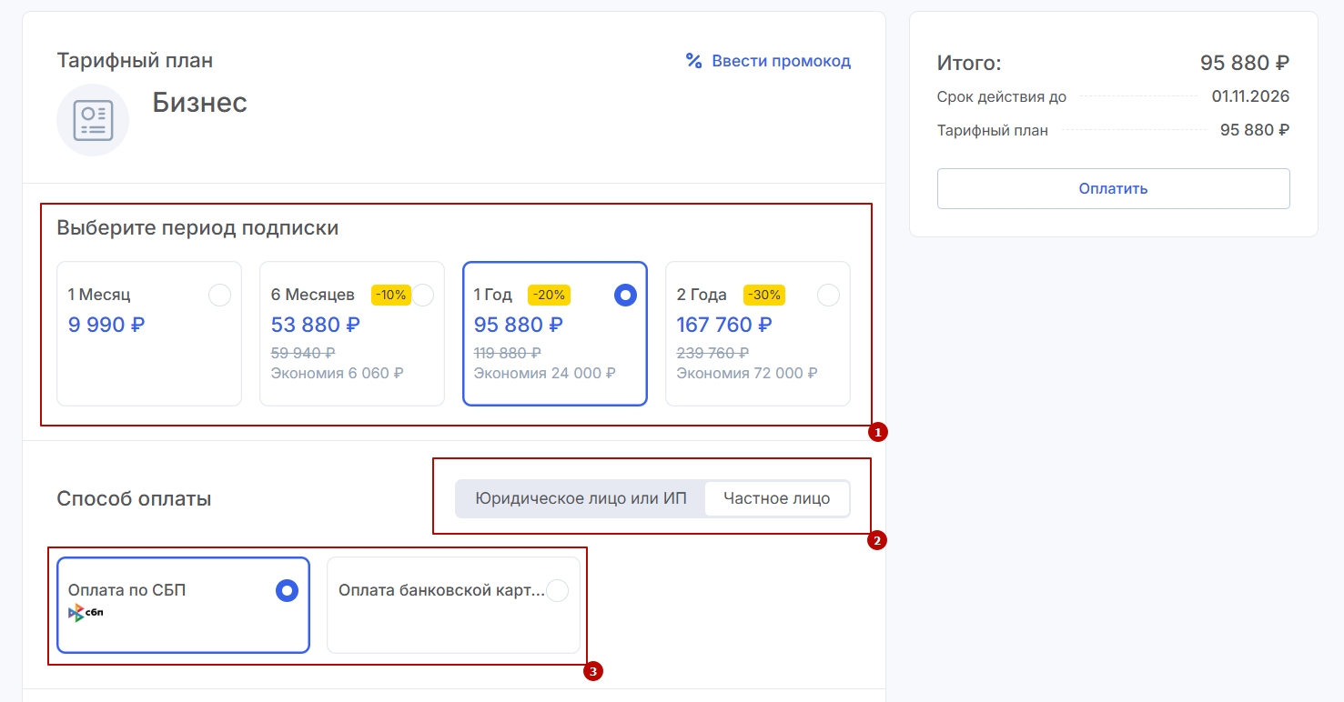 - укажите способ оплаты (3): банковской картой или через СБП для физлиц, либо выставлением счета на оплату для юридических лиц и ИП.