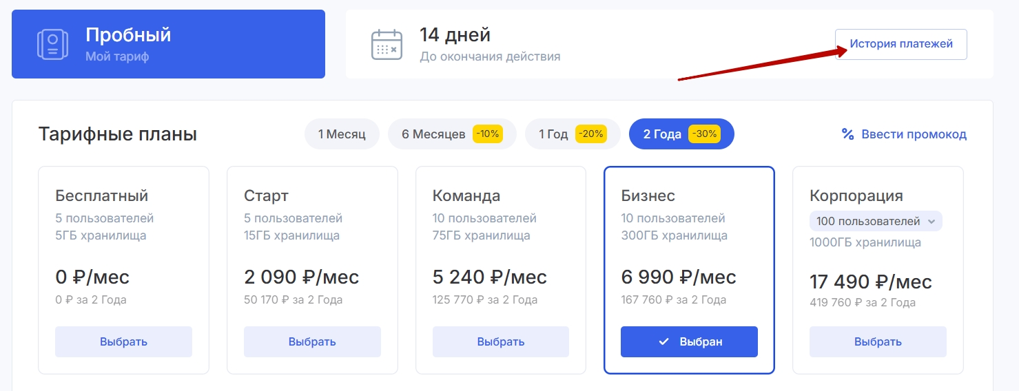 На странице «Мой тариф» нажмите «Оплатить» под наименованием тарифа в левом верхнем углу. Далее выберите способ оплаты — «Счет на оплату».